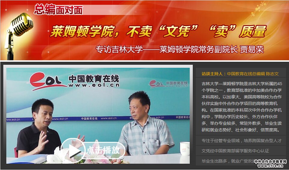 贾院长:好,那就长话短说。我们学校到现在将近有15年了,它是一所中外合作办学机构,这所机构有几个重要时间节点:一个是1999年建立的,那时候是经吉林省教委批准的;到2000年是经过国务院学位办正式批准成立的中外合作办学项目。到2007年经教育部复核为中外合作办学机构,现在我们学校不仅是一所中外合作办学机构,同时也是国家中外合作办学专业委员会首届理事会担任理事单位,这是首批的。我们学校办学15年,经过了两个校区,现在的南湖校区,即合校前时的长春邮电学院,以及现址莱姆顿学院。