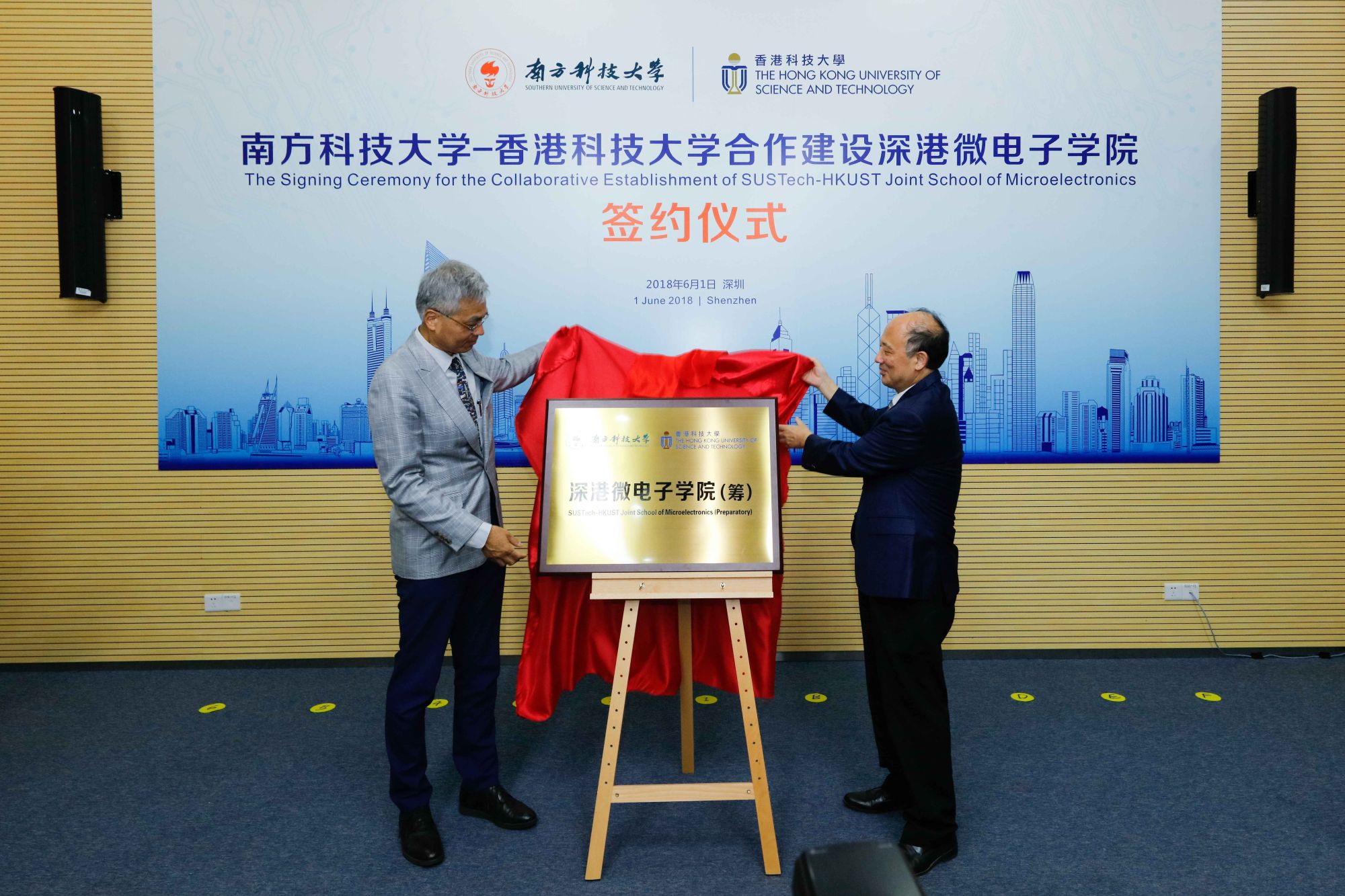 2018年6月1日下午,南方科技大学—香港科技大学合作建设深港微电子学院签约仪式在南科大国际会议厅举行,两校共建的“深港微电子学院(筹)”正式揭牌。香港中联办教科部部长李鲁,广东省教育厅副厅长邢锋,深圳市副市长高自民,南方科技大学党委书记郭雨蓉、校长陈十一,香港科技大学署理校长史维等出席仪式。我校副校长鲁春主持仪式。